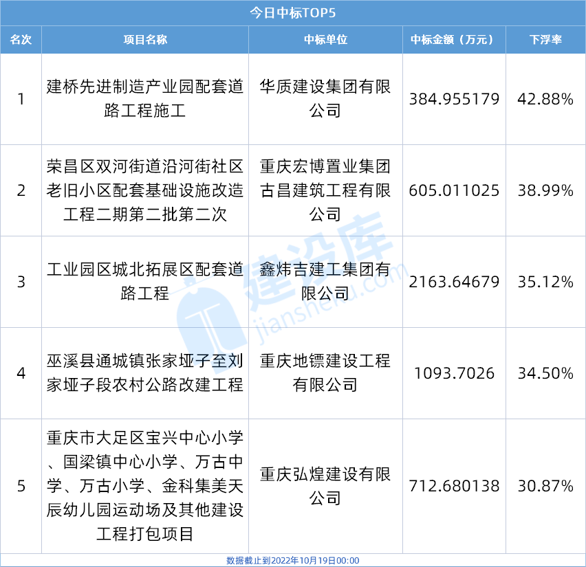 据建设库大数据综合服务平台统计,截止到2022年10月19日00:00点整,重庆公共资源交易网中标公示项目为35个,其中下浮率超过15%的有12个。