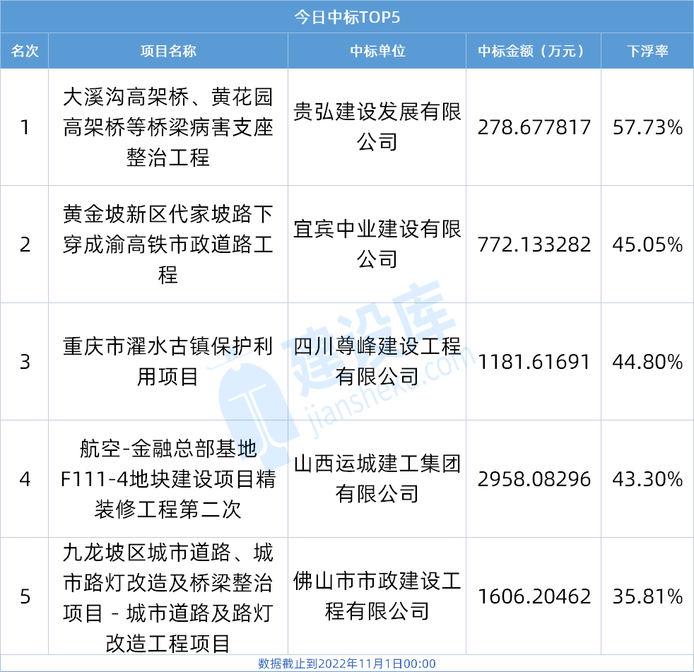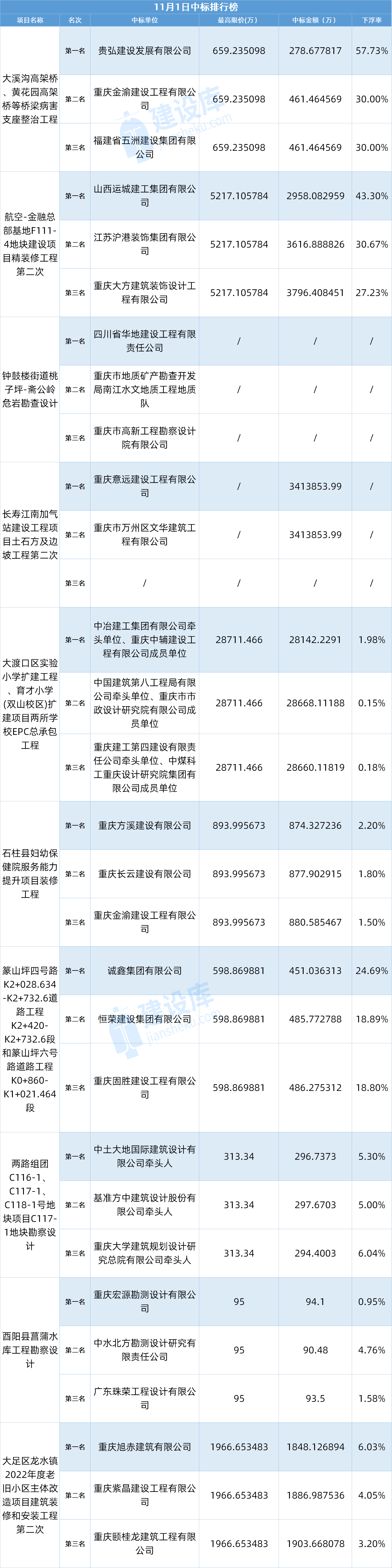 据建设库大数据综合服务平台统计,截止到2022年11月1日00:00点整,重庆公共资源交易网中标公示项目为41个,其中下浮率超过15%的有24个。