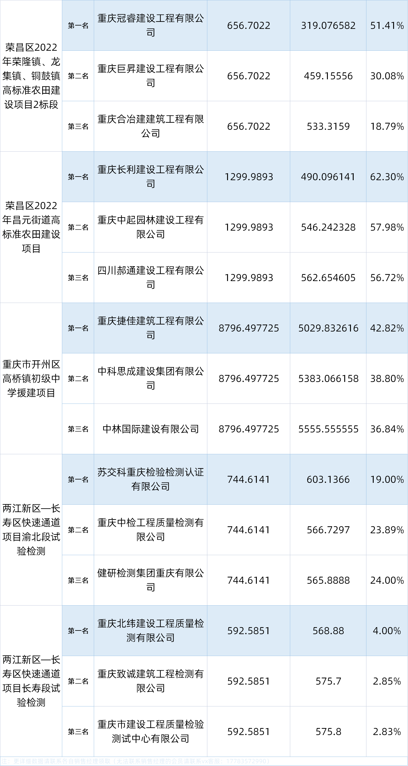 从榜单可以看到,排在第一位的是重庆长利建设工程有限公司,以490.096141万元的报价中标荣昌区2022年昌元街道高标准农田建设项目,最高限价为1299.9893万元。下浮率为62.3%!
