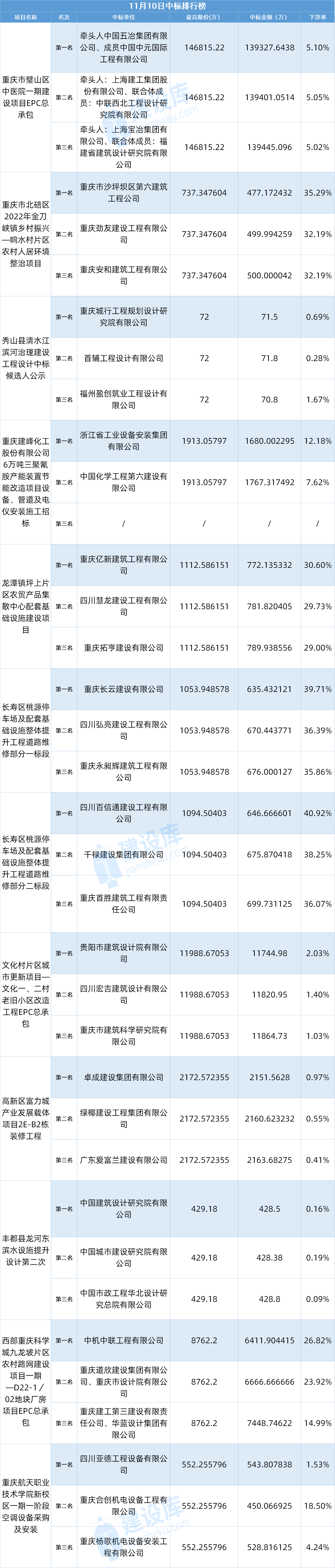 据建设库大数据综合服务平台统计,截止到2022年11月10日00:00点整,重庆公共资源交易网中标公示项目为28个,其中下浮率超过15%的有15个。
