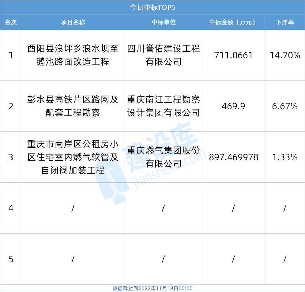 据建设库大数据综合服务平台统计,截止到2022年11月18日00:00点整,重庆公共资源交易网中标公示项目为3个,其中下浮率超过15%的有0个。