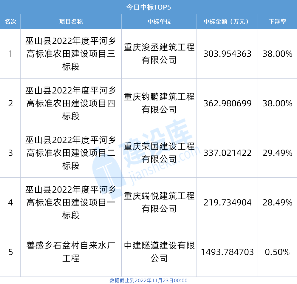 据建设库大数据综合服务平台统计,截止到2022年11月23日00:00点整,重庆公共资源交易网中标公示项目为5个,其中下浮率超过15%的有4个。