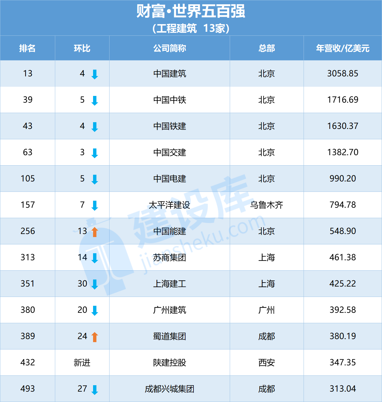 近日,财富Plus APP全球同步发布了2023年《财富》世界500强排行榜。中国共有142家公司上榜,其中工程与建筑行业有13家中国企业上榜: