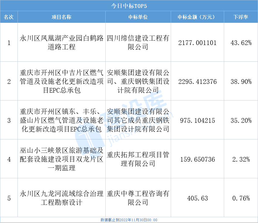 据建设库大数据综合服务平台统计,截止到2022年11月30日00:00点整,重庆公共资源交易网中标公示项目为5个,其中下浮率超过15%的有3个。