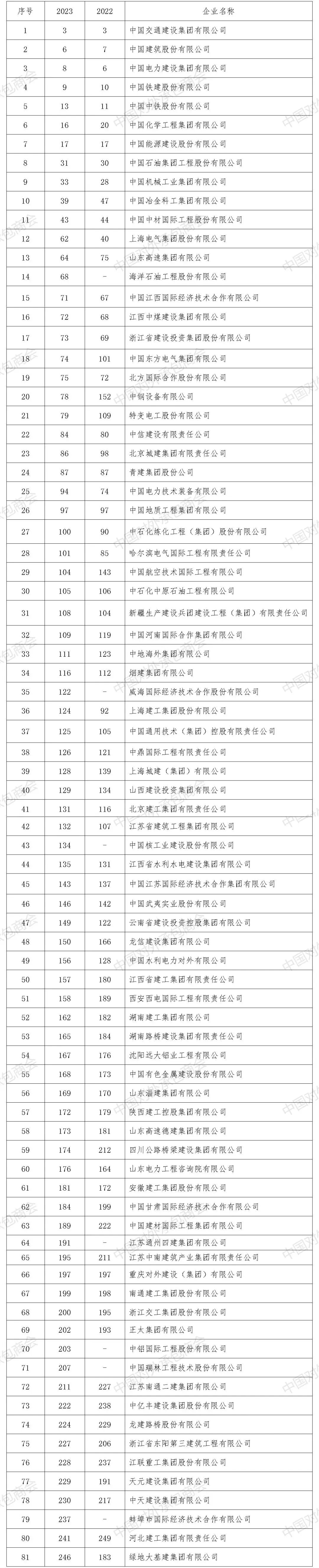 美国当地时间8月23日,2023年度美国《工程新闻纪录(ENR)》“全球最大250家国际承包商”榜单发布。由中国对外承包工程商会统一组织参与申报的中国内地企业(以下简称“中国企业”)中,共有81家企业入围2023年度“全球最大250家国际承包商”。