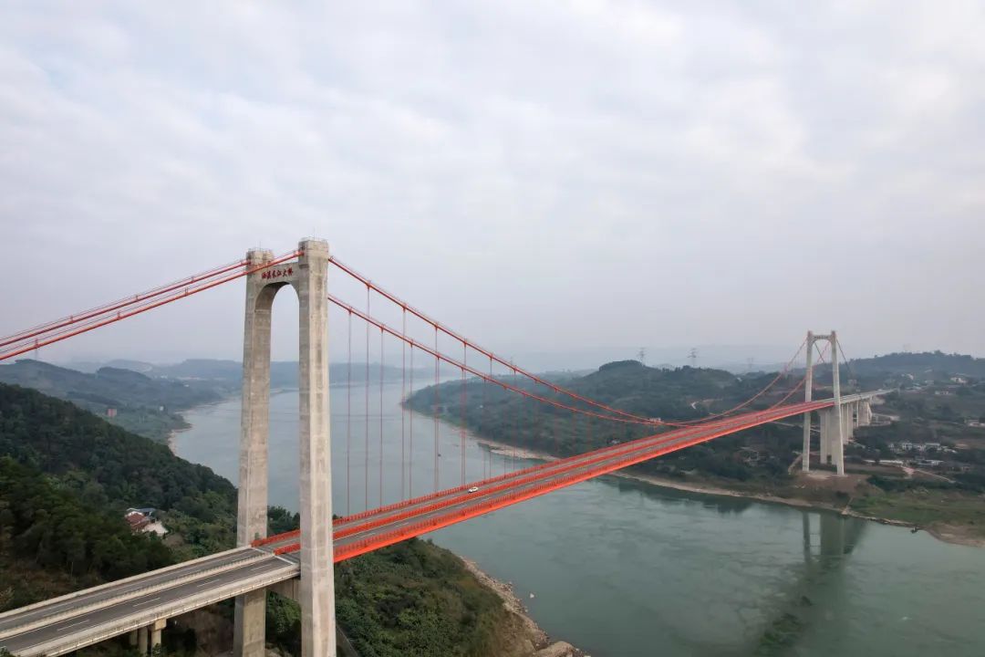 作为中国铁建第一座自主设计、自主施工、自主投资、自主运营“四位一体”的悬索桥,油溪长江大桥全长1178米,主跨760米,是江津段主要控制性工程。该桥拥有国内最大倾角的隧道式锚碇,其桥塔是国内同类型大桥中高差最大的不等高斜腿框架桥塔。