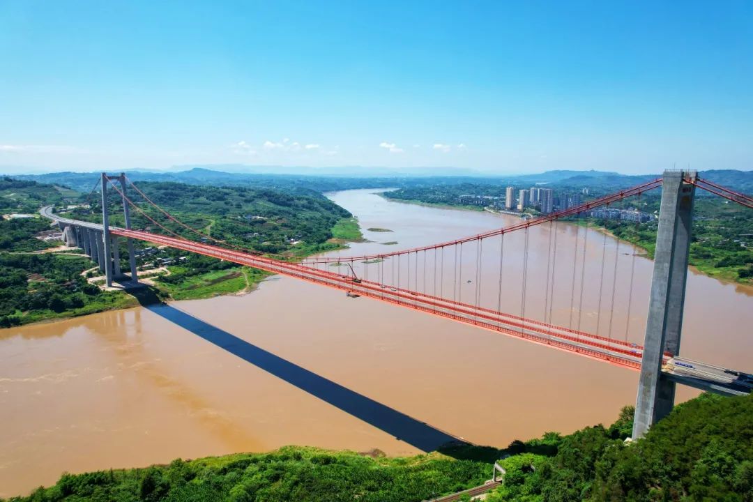面对交通运输组织困难、跨江涉铁陡坡环境复杂等难题,中国铁建大桥局项目团队研发了悬索桥建设管理、巡检养护、健康监测一体化平台,形成了成套的深路堑超大倾角隧道锚设计理论与施工关键技术成果等,顺利攻克建设难题。