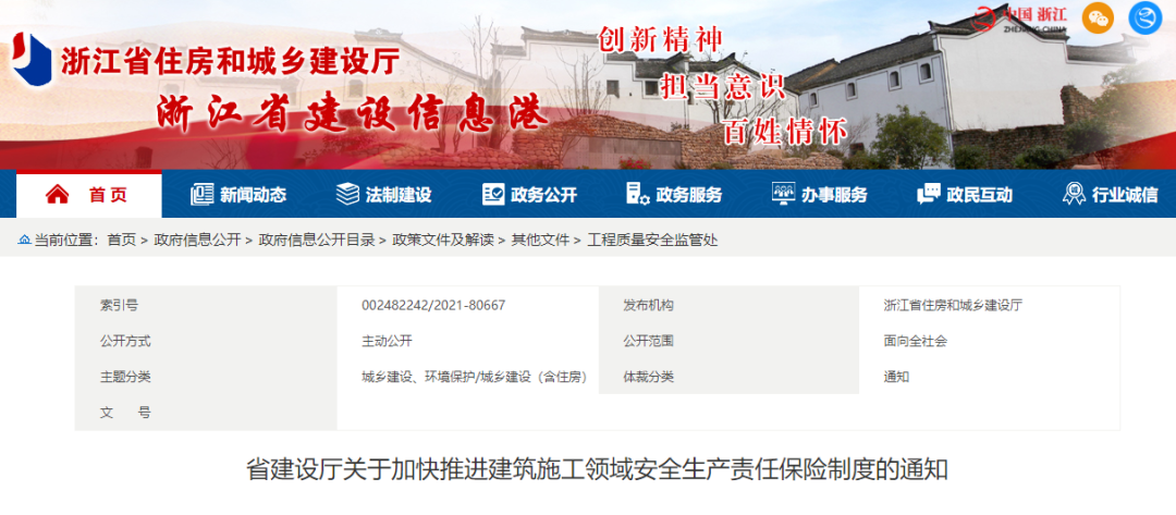 11月1日,浙江省住建厅发布《关于加快推进建筑施工领域安全生产责任保险制度的通知》。明确: