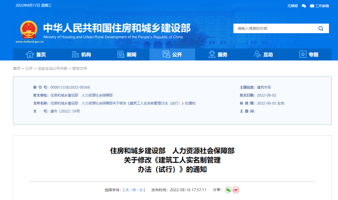 8月16日,住房和城乡建设部、人力资源和社会保障部印发通知,修改《建筑工人实名制管理办法(试行)》部分条款。