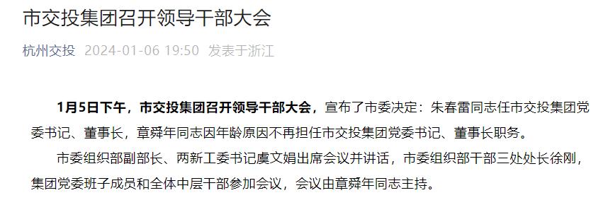 1月5日下午,杭州市交投集团召开领导干部大会,宣布了市委决定:朱春雷同志任市交投集团党委书记、董事长。章舜年同志因年龄原因不再担任市交投集团党委书记、董事长职务。