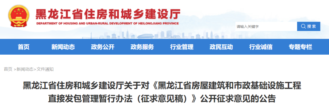 近日,黑龙江省住建厅发布《关于对<黑龙江省房屋建筑和市政基础设施工程直接发包管理暂行办法(征求意见稿)>公开征求意见的公告》。明确: