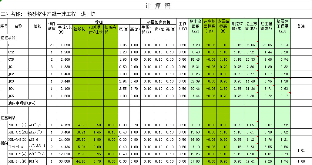 2、砼:预制砼柱、板、楼梯、烟道垃圾道通风道,砼构筑物,现浇砼基础、柱、梁、墙、板,天沟挑YAN、雨篷、阳台板,其他构件、后浇带。3、砌筑工程:砖石基础、砖石砌体、空斗墙、空花墙、填充墙、实心砖柱、零星砌砖(蹲台、花台、花池、楼梯栏板、阳台栏板)、砖烟囱、砖水塔、空心砖墙、砌块墙、围墙、空心砖柱、砌块柱、烟道垃圾道通风道;4、土石方工程:挖土方、基础土方、管沟土方、石方开挖、土石方回填;