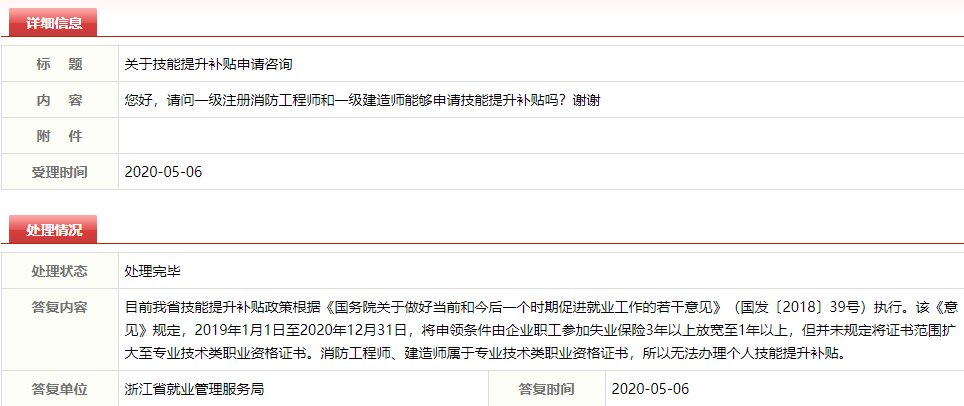 目前我省技能提升补贴政策根据《国务院关于做好当前和今后一个时期促进就业工作的若干意见》(国发〔2018〕39号)执行。该《意见》规定,2019年1月1日至2020年12月31日,将申领条件由企业职工参加失业保险3年以上放宽至1年以上,但并未规定将证书范围扩大至专业技术类职业资格证书。消防工程师、建造师属于专业技术类职业资格证书,所以无法办理个人技能提升补贴。