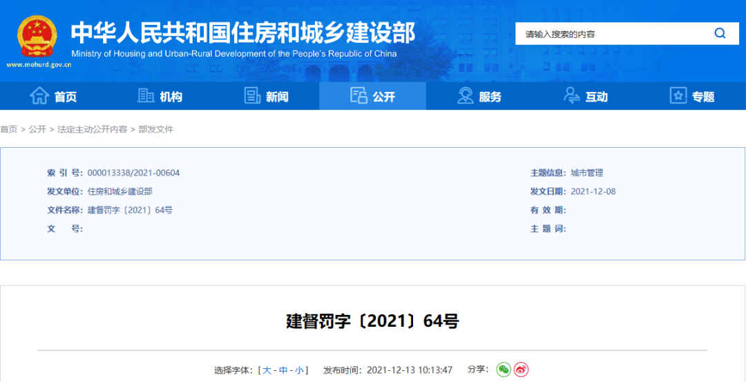 2021年12月13日,住建部下发《建督罚字〔2021〕64号》,给予项目经理吊销一级建造师注册证书,终身不予注册的行政处罚。