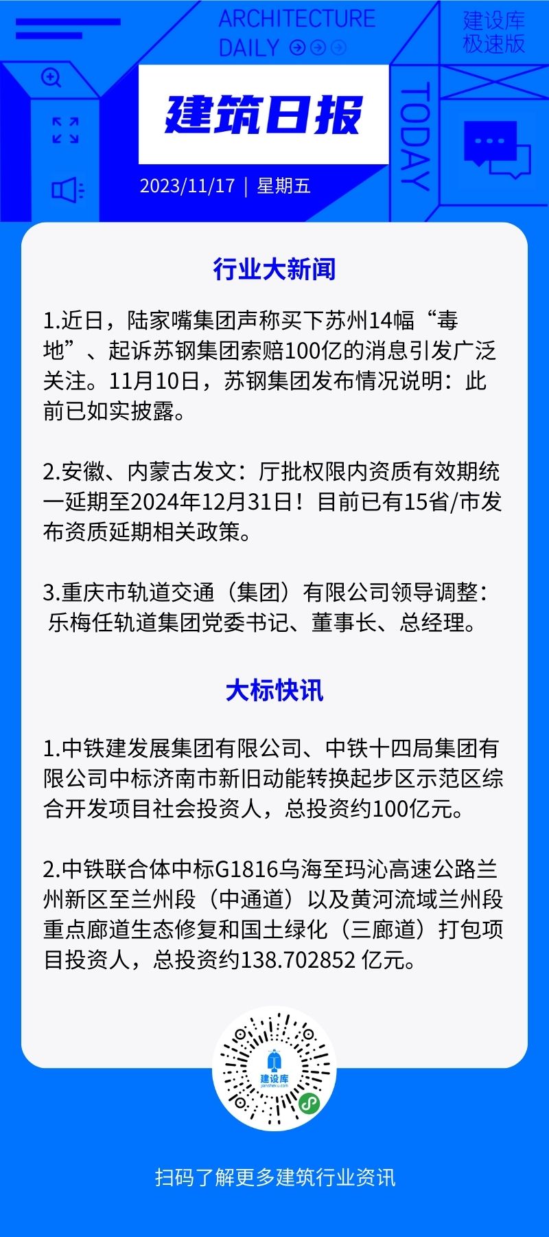 1.近日,陆家嘴集团声称买下苏州14幅“毒地”、起诉苏钢集团索赔100亿的消息引发广泛关注。11月10日,苏钢集团发布情况说明:此前已如实披露。