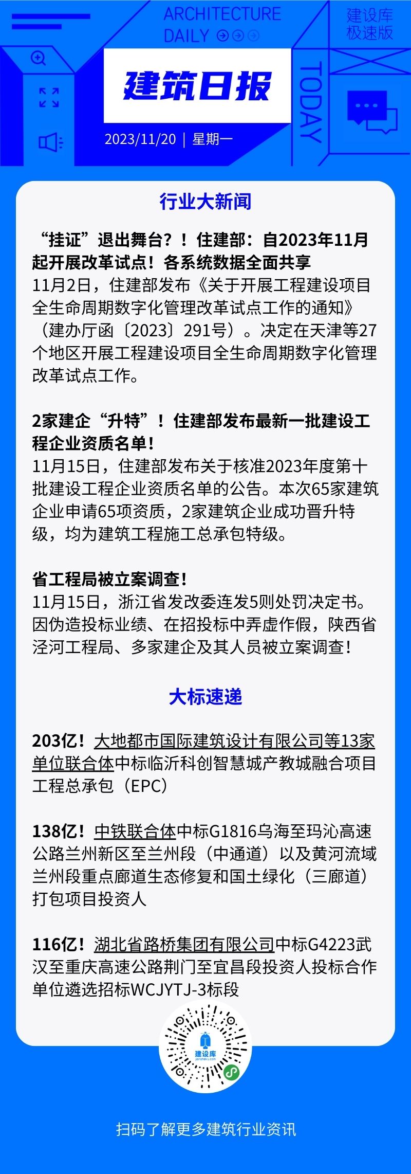 11月15日,住建部发布关于核准2023年度第十批建设工程企业资质名单的公告。本次65家建筑企业申请65项资质,2家建筑企业成功晋升特级,均为建筑工程施工总承包特级。