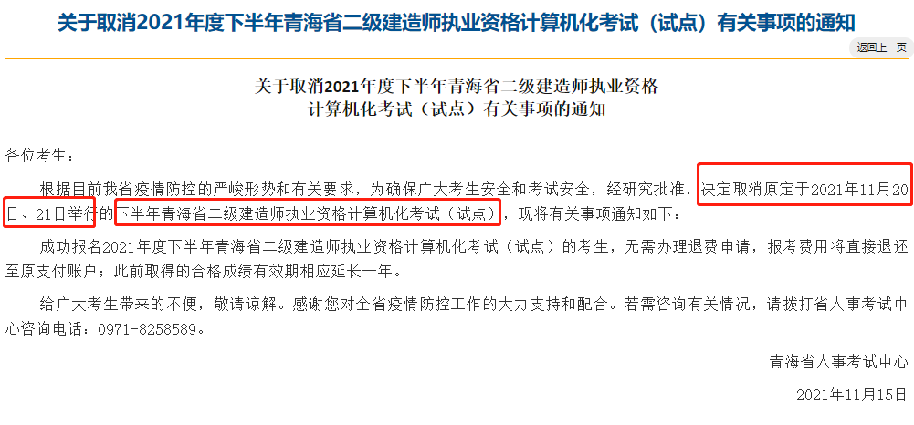 根据目前我省疫情防控的严峻形势和有关要求,为确保广大考生安全和考试安全,经研究批准,决定取消原定于2021年11月20日、21日举行的下半年青海省二级建造师执业资格计算机化考试(试点),现将有关事项通知如下: