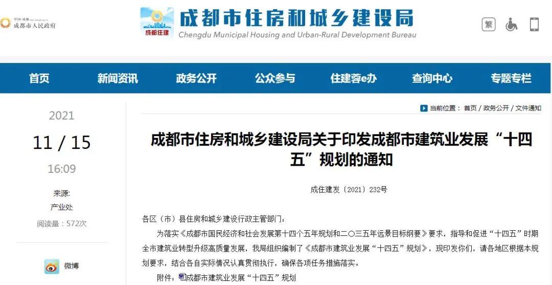 11月15日,成都市住房和城乡建设局印发《成都市建筑业发展“十四五”规划》,要求2021年起城镇新建建筑原则上全部执行装配式建筑要求,并提出2025年装配式建筑占当年城镇新建建筑比例达到80%的目标。