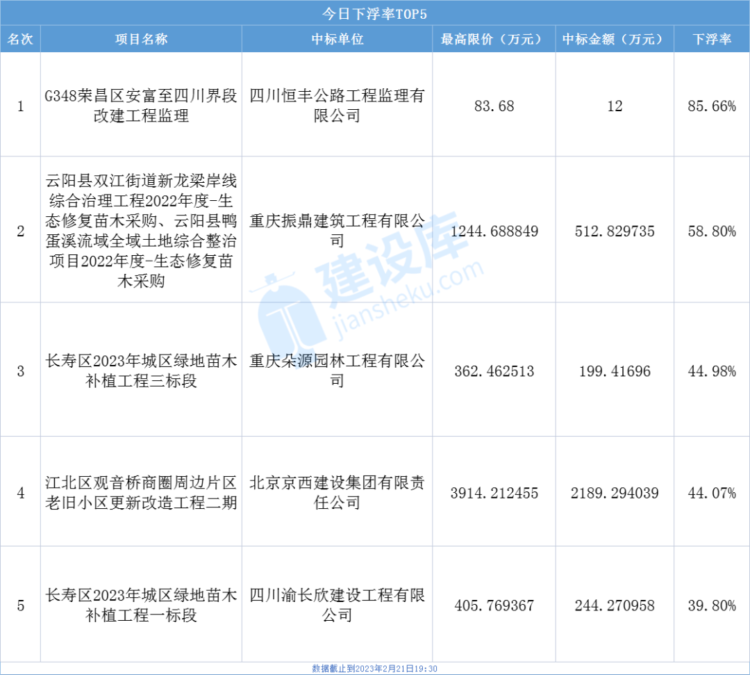 【2月21日重庆中标详情】据建设库大数据综合服务平台统计,截止到2023年2月21日19:30点,重庆公共资源交易网中标公示项目共25个,其中施工项目17个,监理1个,设计2个,其他5个;出现废标情况的项目有9个。