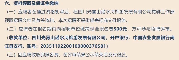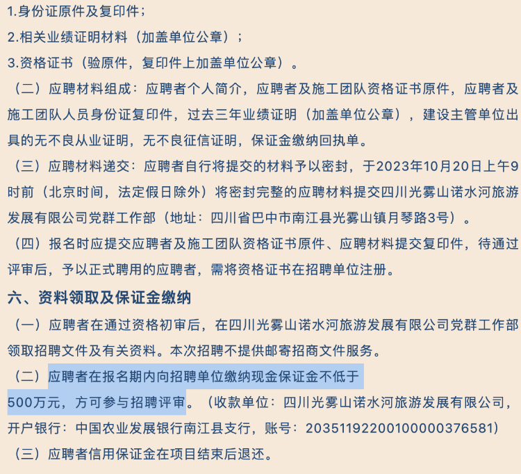 上游新闻记者注意到,诺水河旅游公司在发布的招聘公告中提到:“泰达建工本次招聘3名项目经理,与泰达建工签订劳务合同,薪酬待遇:底薪+项目管理奖励。应聘时携带的材料包括个人简介及其施工团队资格证书等。在报名期内向招聘单位缴纳现金保证金不低于500万元,方可参与招聘评审。保证金在项目结束后退还。”