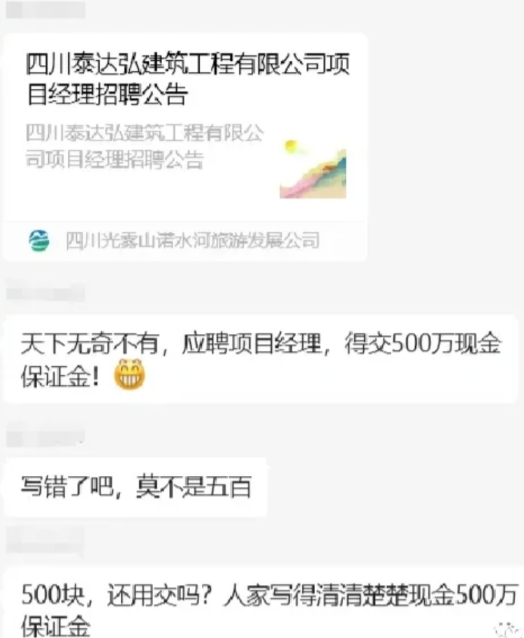 四川巴中市的王先生(化名)看到公告感叹:“我有500万现金,还去应聘什么项目经理?”他将截图发到网上引发关注。有人感到震惊,“干到退休可能挣不到500万,还先交500万现金”“应聘一个职位,还要先交钱,这不是骗钱吗?”还有人分析说:“项目找垫资进场是这么找的?”“等项目结束后退还保证金,明显就是自己没钱要用别人的钱来当做前期的启动资金,都是玩剩下的老套路。”