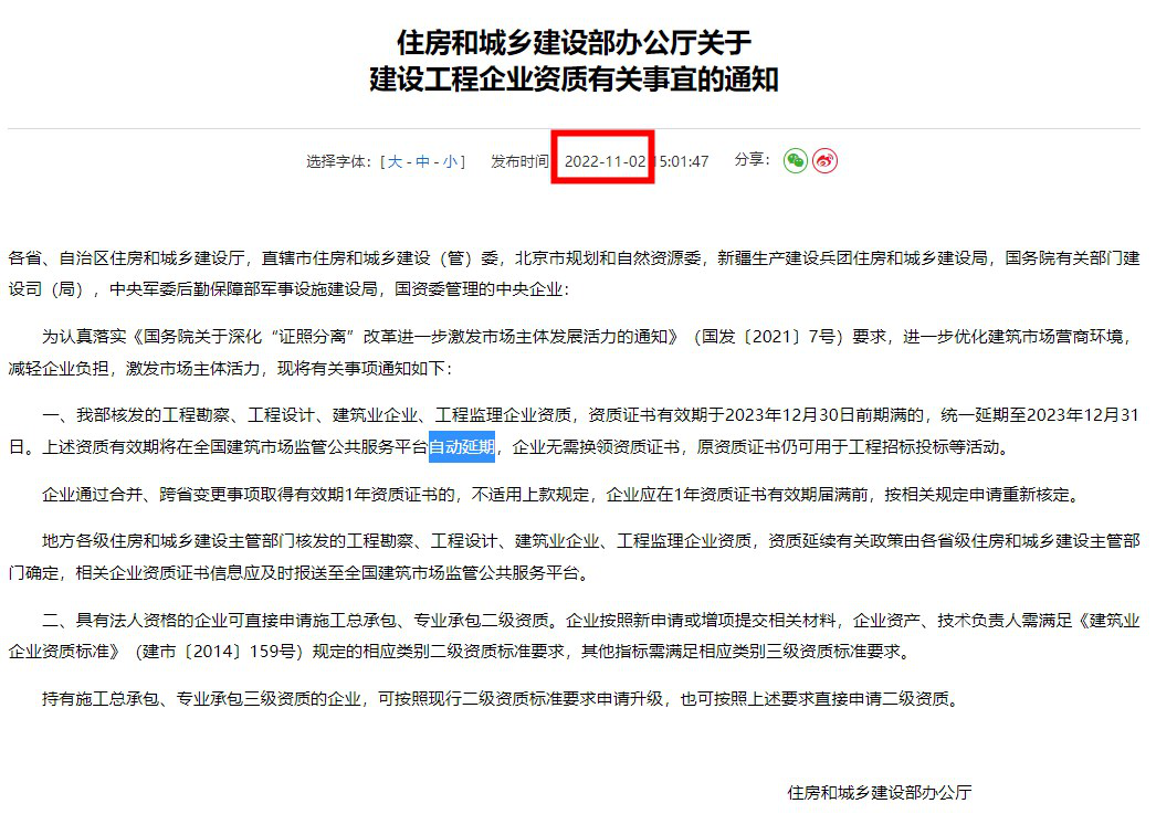 1、资质申请:这是最大的不同。大家先看下21年、22年的通知,仔细看,是“自动延期”,企业不需要申请,不用换证,“四库一平台”上自动延期。2023年如果你不自己主动申请,1月1日起就延续不了、不予受理。所以,特级、一级企业一定要重视!为什么要申请呢?往下看~