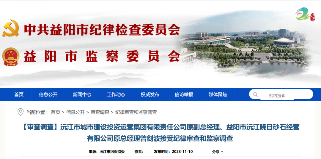 沅江市纪委监委11月10日通报:沅江市城投公司原副总经理曾剑波被查;