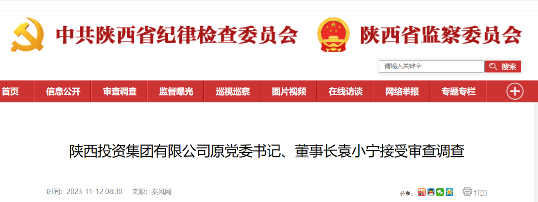 陕西省纪委监委11月12日通报:陕西投资集团有限公司原党委书记、董事长袁小宁涉嫌严重违纪违法,目前正接受陕西省纪委监委纪律审查和监察调查。