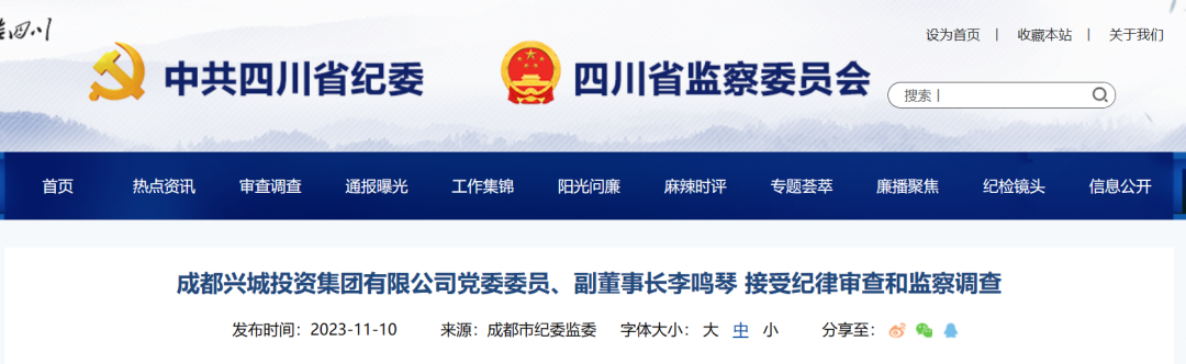 四川省纪委监委11月10日通报:成都兴城投资集团有限公司党委委员、副董事长李鸣琴被查;
