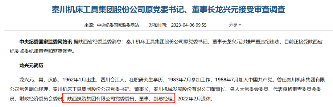 值得关注的是,今年4月,中纪委官网通报称,秦川机床工具集团股份公司原党委书记、董事长龙兴元涉嫌严重违纪违法,目前正接受陕西省纪委监委纪律审查和监察调查。