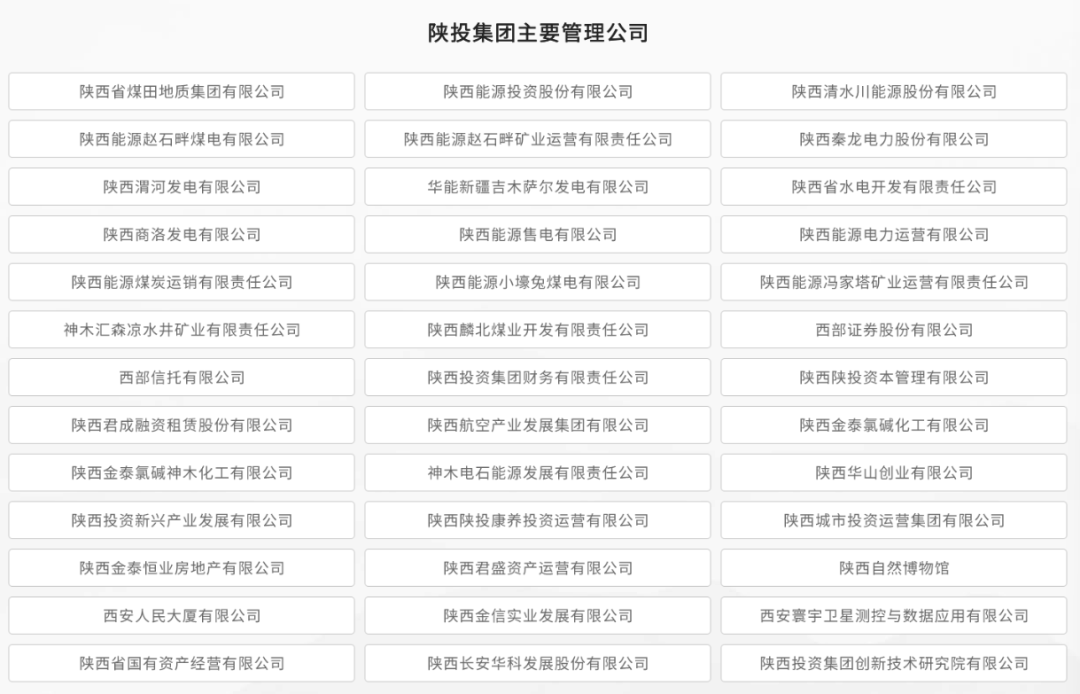 除从事能源领域的投资运营外,陕投集团旗下还包括西部信托、西部证券、陕投资本、君成租赁等金融、投资公司,并参股永安财险、华泰保险等保险公司。