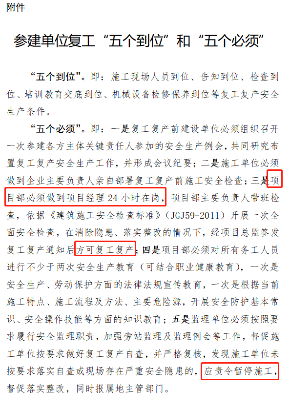 多省住建厅发文,要求严格落实“五个必须”,合格后方可复工,其中一项为项目部必须做到项目经理24小时在岗。