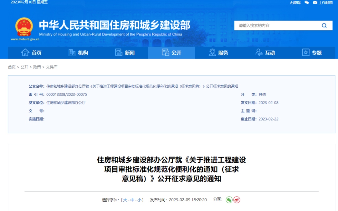 2月9日,住建部官网发布《关于推进工程建设项目审批标准化规范化便利化的通知》公开征求意见的通知,加快推进房屋建筑和城市基础设施等工程建设项目审批标准化、规范化、便利化。具体如下: