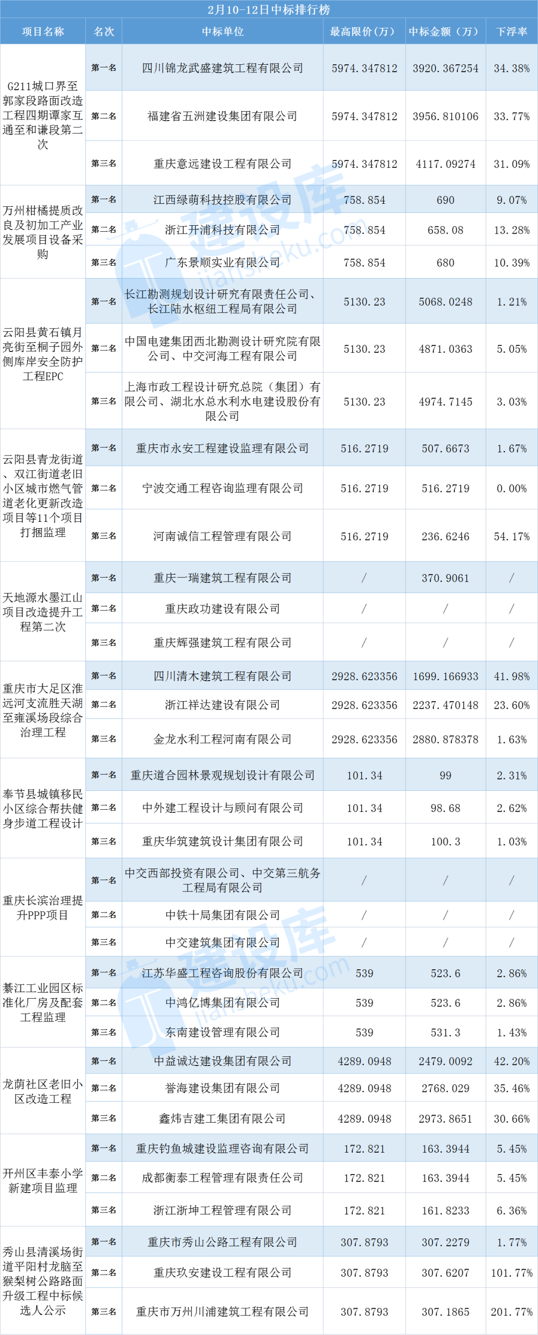 【2月10-12日重庆中标详情】据建设库大数据综合服务平台统计,截止到2023年2月13日00:00点整,重庆公共资源交易网中标公示项目共12个,其中施工项目7个,监理3个,设计1个,PPP1个;出现废标情况的项目有1个。