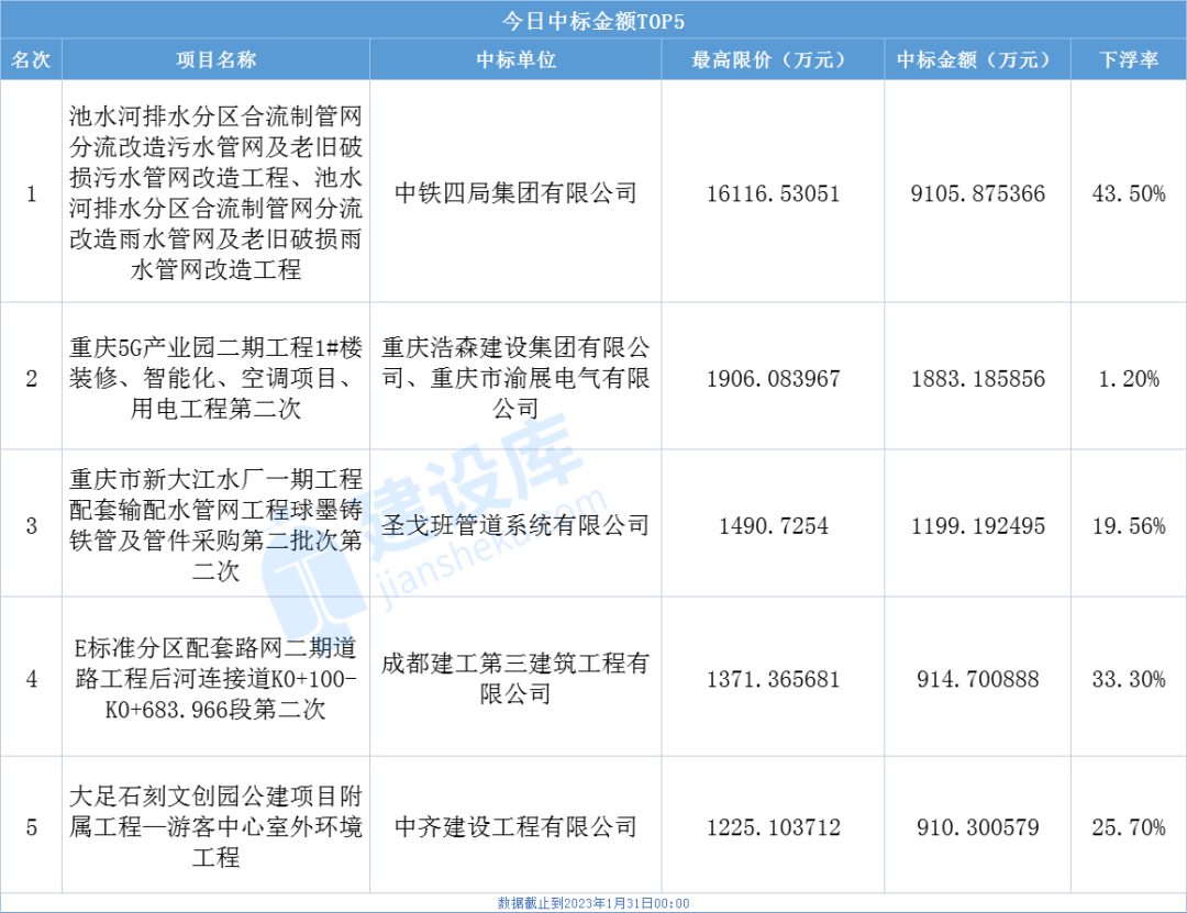 【1月31日重庆中标详情】据建设库大数据综合服务平台统计,截止到2023年1月31日00:00点整,重庆公共资源交易网中标公示项目共22个,其中施工项目16个,监理4个,设计1个,其他1个;出现废标情况的项目有6个。