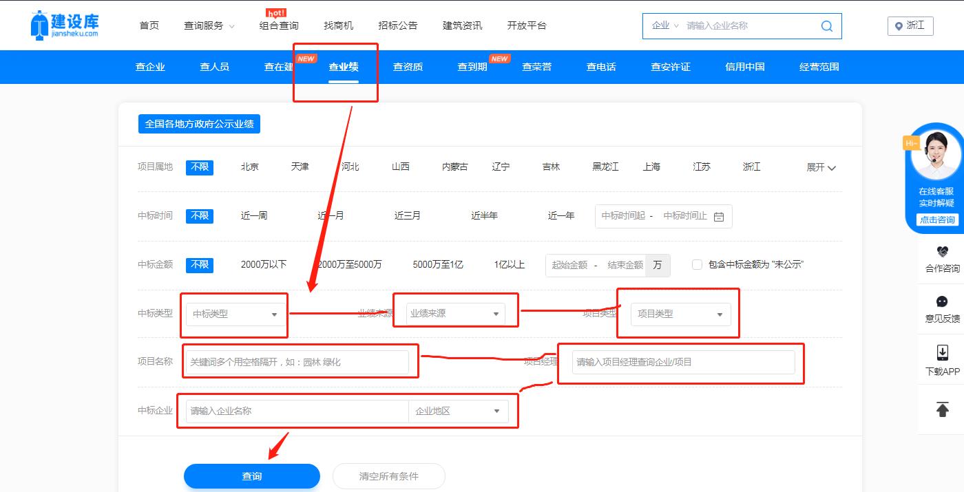 2.进入建设库平台首页,点击“查业绩”栏目,筛选相应查询条件即可