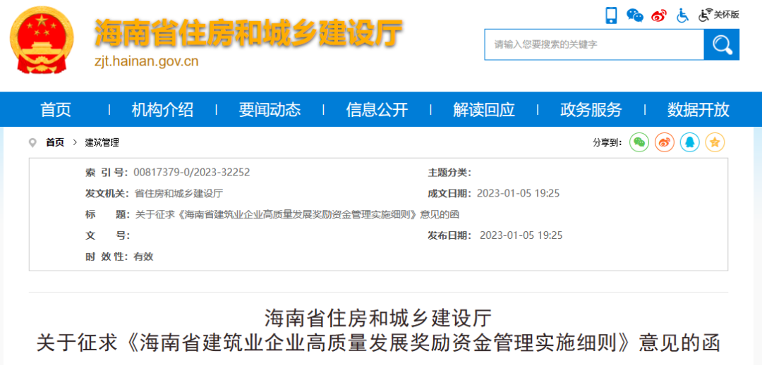 近日,海南省住建厅发布《关于征求<海南省建筑业企业高质量发展奖励资金管理实施细则>意见的函》,提出: