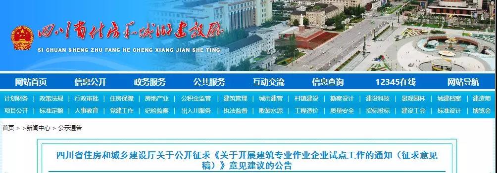 8月5日,四川省住建厅发布《关于开展建筑专业作业企业试点工作的通知(征求意见稿)》。