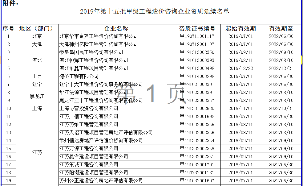 附件:2019年第十五批甲级工程造价咨询企业资质延续名单