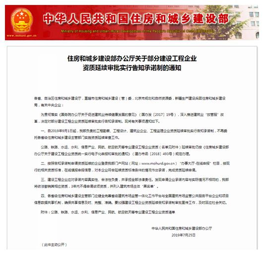 一、自2019年9月1日起,我部负责的工程勘察、工程设计、建筑业企业、工程监理企业资质延续审批实行告知承诺制,不再委托各省级住房和城乡建设主管部门实施资质延续审查工作。