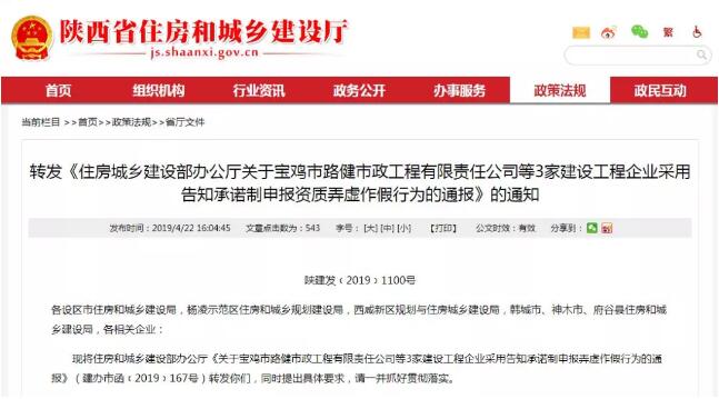 近日,省住建厅转发《住房城乡建设部办公厅关于宝鸡市路健市政工程有限责任公司等3家建设工程企业采用告知承诺制申报资质弄虚作假行为的通报》的通知,并对我省建筑业企业资质申报工作提出具体要求。