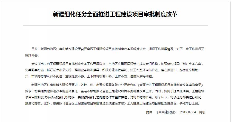 新疆自治区住房和城乡建设厅要求,各地、州、市要按照国务院办公厅出台的《全面推进工程建设项目审批制度改革实施意见》要求,切实担负起推进改革的主体责任,坚定不移地推动全区工程建设项目审批制度改革工作。同时,要勇于担当抓落实。工程建设项目审批制度改革涉及的部门机构多,要加强各部门之间的协作来整体推进,对每个时间节点、每个环节、每项任务都要进行细化、跟进和落实。此外,要按照《自治区工程建设项目审批管理系统建设方案》全力推进工程建设项目审批系统建设,争取早日上线。