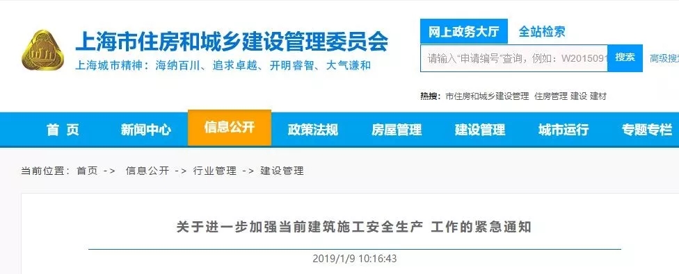 2019年1月9日,上海市住建委发布《关于进一步加强当前建筑施工安全生产工作的紧急通知》,要求开展安全生产大检查,狠抓隐患排查治理,重点排查高大模板、深基坑和起重吊装等危险性较大的分部分项工程。具体包括: