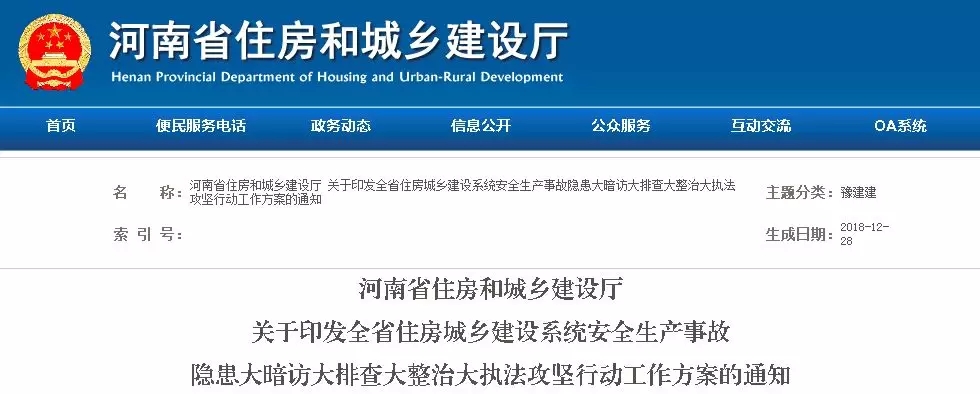 河南省住建厅发文:即日起开始,到2019年6月底前,对全省所有住建领域、生产经营单位、项目场所、从业岗位开展全覆盖式的安全生产事故隐患大暗访、大排查、大整治、大执法攻坚行动。