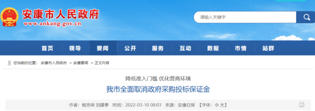 陕西安康:自2022年3月1日起,全市政府采购活动不得向供应商收取投标保证金。