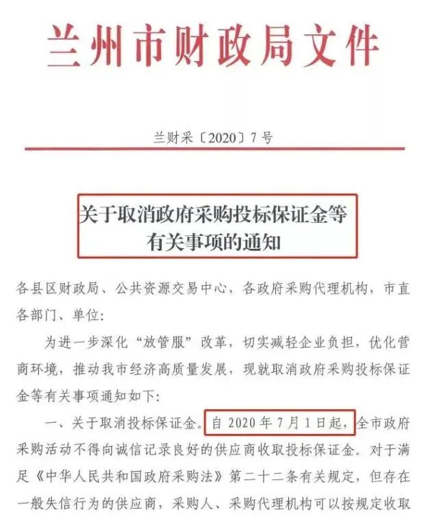 兰州:自2020年7月1日起,取消政府采购投标保证金。