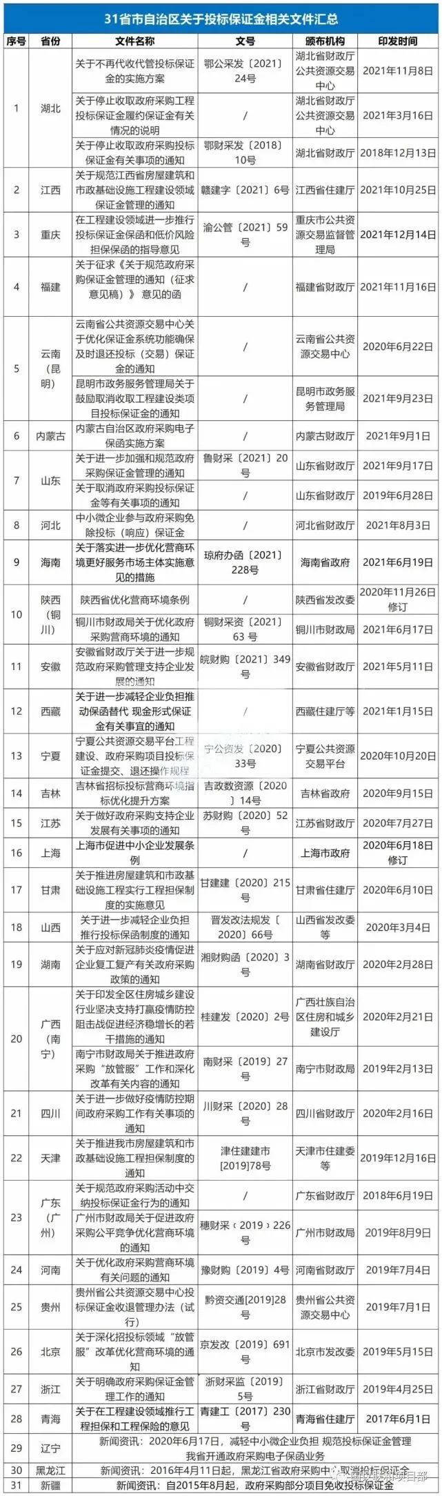 31省市关于投标保证金政策汇总