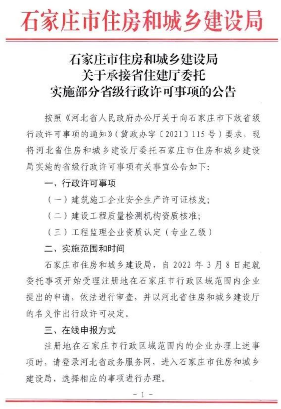 石家庄市住房和城乡建设局、行政审批局就委托事项,自2022年3月8日起受理注册地在石家庄市行政区域范围内企业提出的申请,依法进行审查,并以河北省住房和城乡建设厅的名义作出行政许可决定。