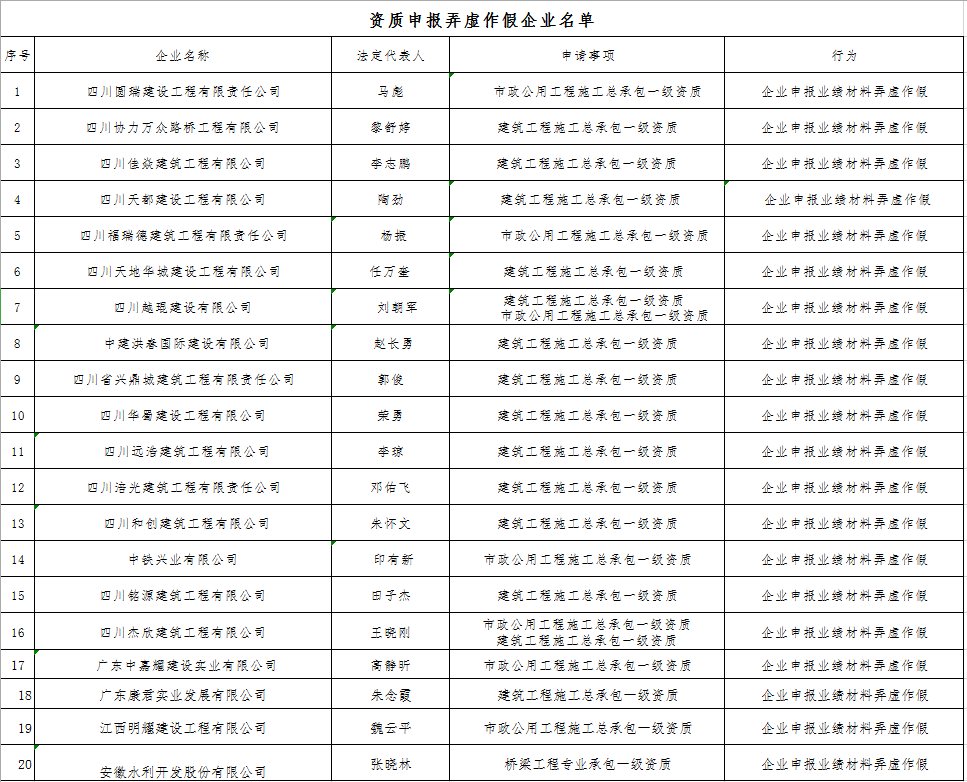 2、四川圆瑞建设工程有限责任公司等20家建设工程企业资质申报弄虚作假