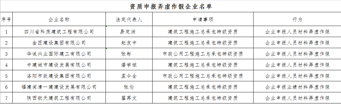 经查,四川省科茂建筑工程有限公司等7家建设工程企业在申报施工总承包特级资质中存在弄虚作假行为。根据《中华人民共和国建筑法》《中华人民共和国行政许可法》及《建设工程企业资质申报弄虚作假行为处理办法》(建市〔2011〕200号)等规定,决定对四川省科茂建筑工程有限公司等7家建设工程企业予以通报批评,不批准其资质申请,并将其不良行为在全国建筑市场监管公共服务平台予以公布。自本通报印发之日起1年内不受理上述企业申请该项行政许可。